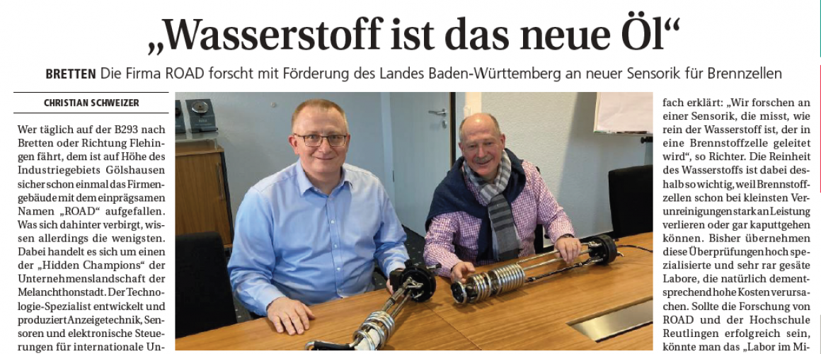 Für ROAD-Geschäftsführer Matthias Richter und Volkmar Uebele, Manager für Forschung und Entwicklung, war die Bewerbung um einen der rar gesäten Plätze im Förderprogramm klar. „Wasserstoff ist das Öl von morgen, denn es ist das wohl effektivste Energie-Speichermedium. Und auch die Politik hat inzwischen erkannt, dass die viel zitierte Energiewende nur mit Wasserstoff gelingen kann“, erklärt Richter im Gespräch mit der Brettener Woche und erhält dabei zustimmendes Kopfnicken von Volkmar Uebele. Und so bewarb man sich gemeinsam mit dem Kooperationspartner, der Hochschule Reutlingen, mit einem, so hofft man, zukunftsweisenden Projekt. Die Idee desselben ist dabei erstaunlich einfach erklärt: „Wir forschen an einer Sensorik, die misst, wie rein der Wasserstoff ist, der in eine Brennstoffzelle geleitet wird“, so Richter. Die Reinheit des Wasserstoffs ist dabei deshalb so wichtig, weil Brennstoffzellen schon bei kleinsten Verunreinigungen stark an Leistung verlieren oder gar kaputtgehen können. Bisher übernehmen diese Überprüfungen hoch spezialisierte und sehr rar gesäte Labore, die natürlich dementsprechend hohe Kosten verursachen. Sollte die Forschung von ROAD und der Hochschule Reutlingen erfolgreich sein, könnte man das „Labor im Miniformat“ gemeinsam mit der Brennstoffzelle in einem mit Wasserstoff betriebenen Fahrzeug, Schiff oder Flugzeug oder auch einer Haus-Heizung verbauen. Die Zelle kann man sich dabei wie eine Batterie vorstellen, in der durch die Reaktion von Wasserstoff und Sauerstoff Energie entsteht. Und das praktisch schadstofffrei.